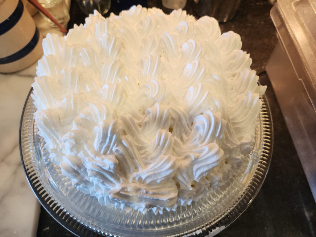 - Seal the entire cake, sides and top, with a thin layer of meringue. Fit the pastry bag with meringue.