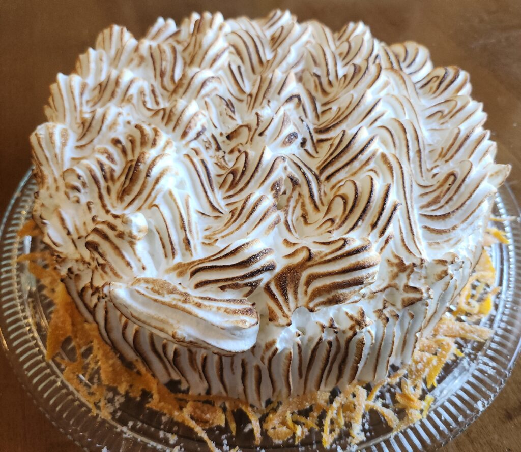 - Brown the meringue with the kitchen torch. Store cake in refrigerator until served. Cake is best enjoyed the same day, although it can be held, refrigerated for another day or so.