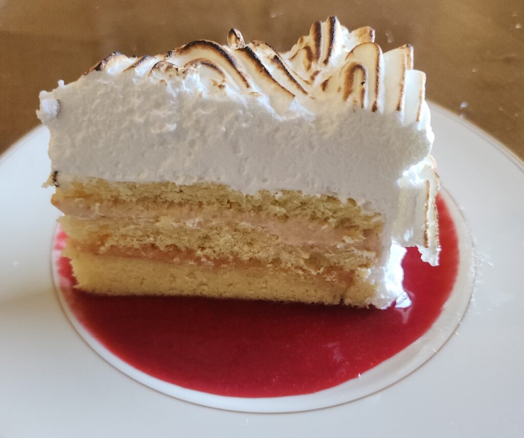 - Make the Italian Meringue. Remove the cake from refrigerator and torch the outside of the cake ring to remove.